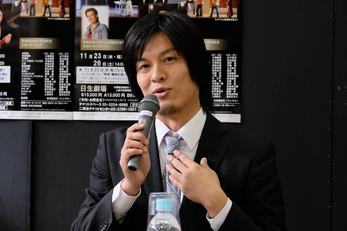 「この作品のオーディションはもう随分前のことになりますが、まさかこの役で東京二期会のデビューになるとは思ってもいなくて、決まったと知らされたときは飛び上がって大喜びしました。新国立劇場研修所の『魔笛』でご一緒したグルーバーさんとまた仕事ができることも、素晴らしい指揮者のもとで歌えることも、大学でも研修所でも先輩だった近藤さんと共演できるのも楽しみで、ほんとうに光栄に思っています」と、どこか新人らしい硬さも感じさせながらも笑顔で語った。