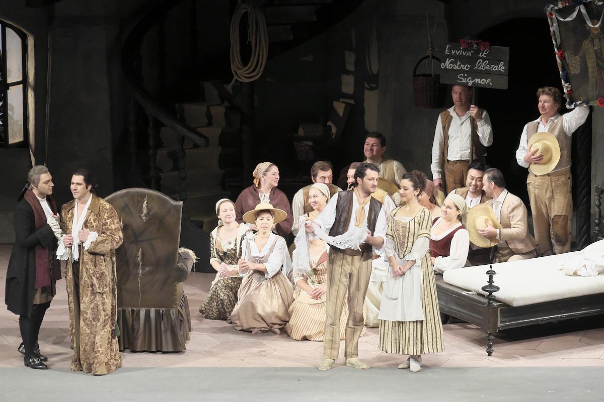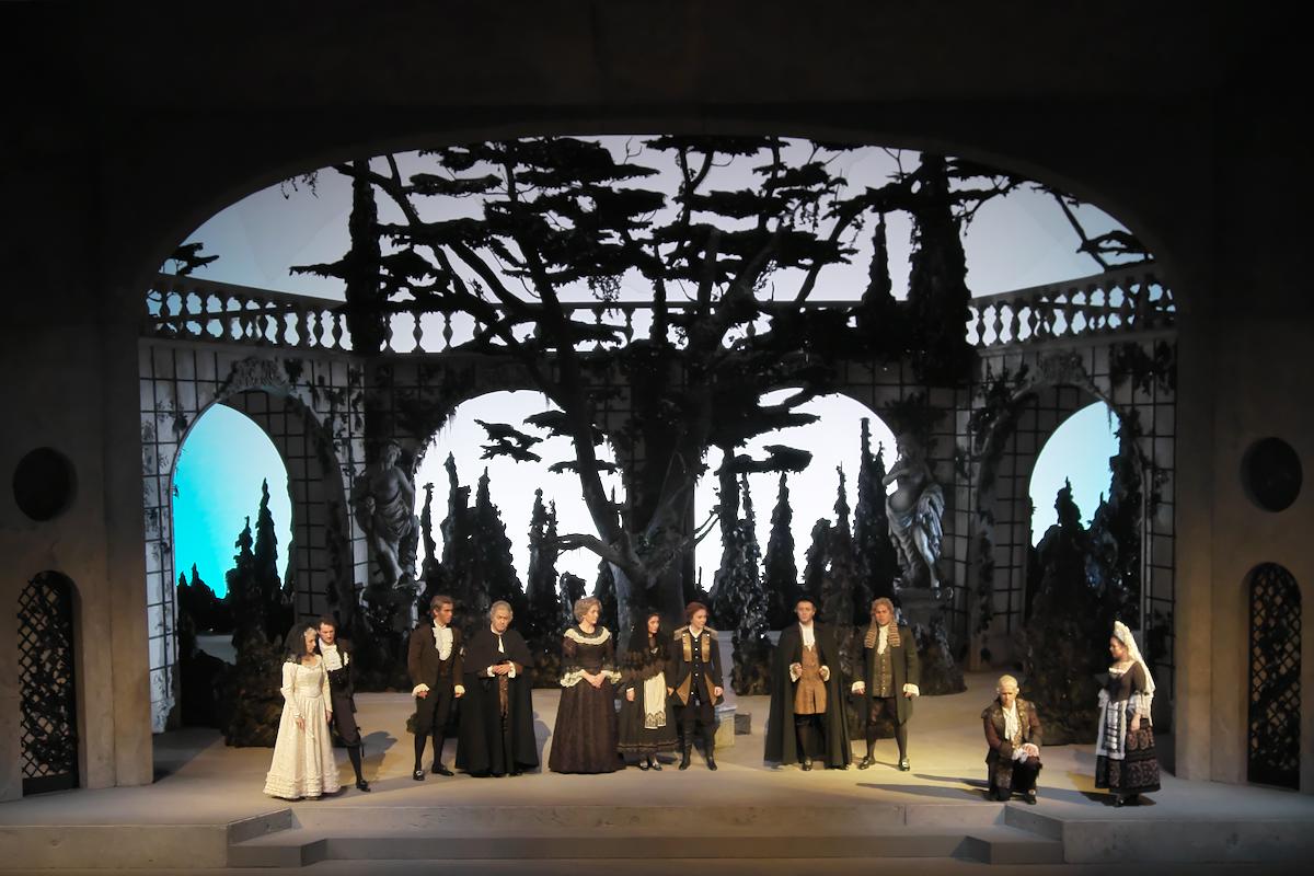 ジャン=ピエール・ポネルの演出は、18世紀当時の時代背景を考慮した、オーソドックスなもの。シックな色合いの装置や衣装も、好ましく感じます。微笑みとユーモアをところどころちりばめて、不偏の人間ドラマを見事に描き出しました。