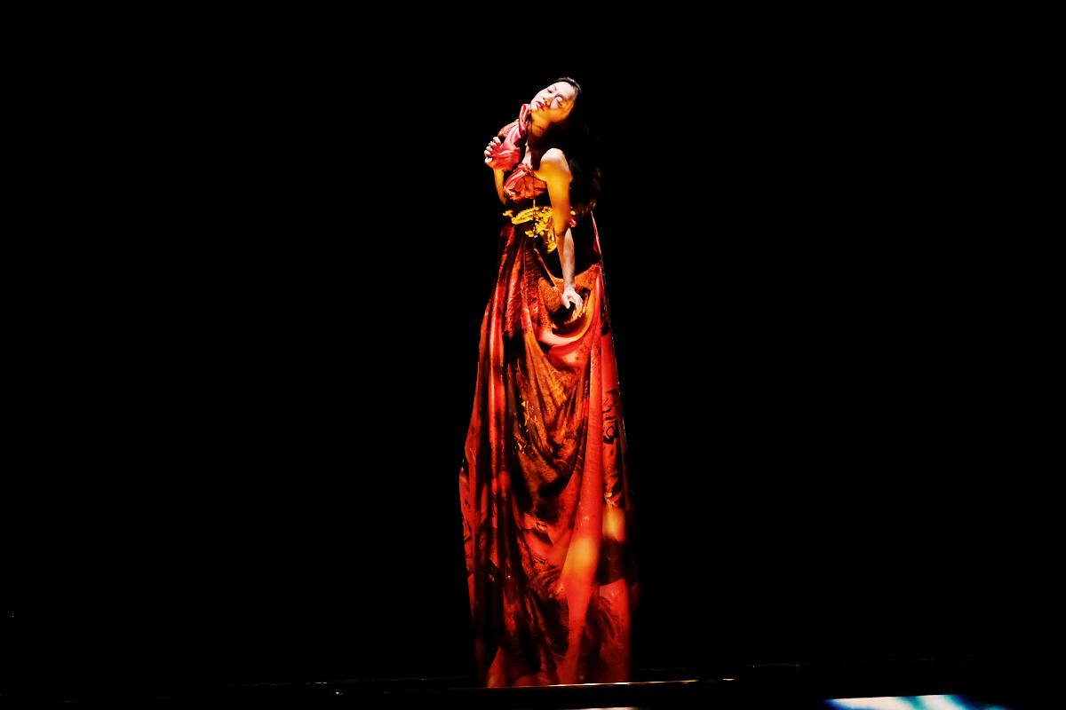 今回の日本初演には、世界初演にも参加した指揮のパトリック・ダヴァン、ダンスの伊藤郁子らも参加し、ソリスティックな技量が要求される特殊な編成のアンサンブルは、東京藝大シンフォニエッタが担当した。作品の”枠”を作る「語りによる劇」として示される「館での主人公と女将の対話」に長塚京三と原田美枝子が参加し、それに伴うセリフ部分の日本語化により(歌唱は英語、部分的に日本語)、今回の日本初演は2009年の作品の単純な再演ではない、特別な舞台となった。